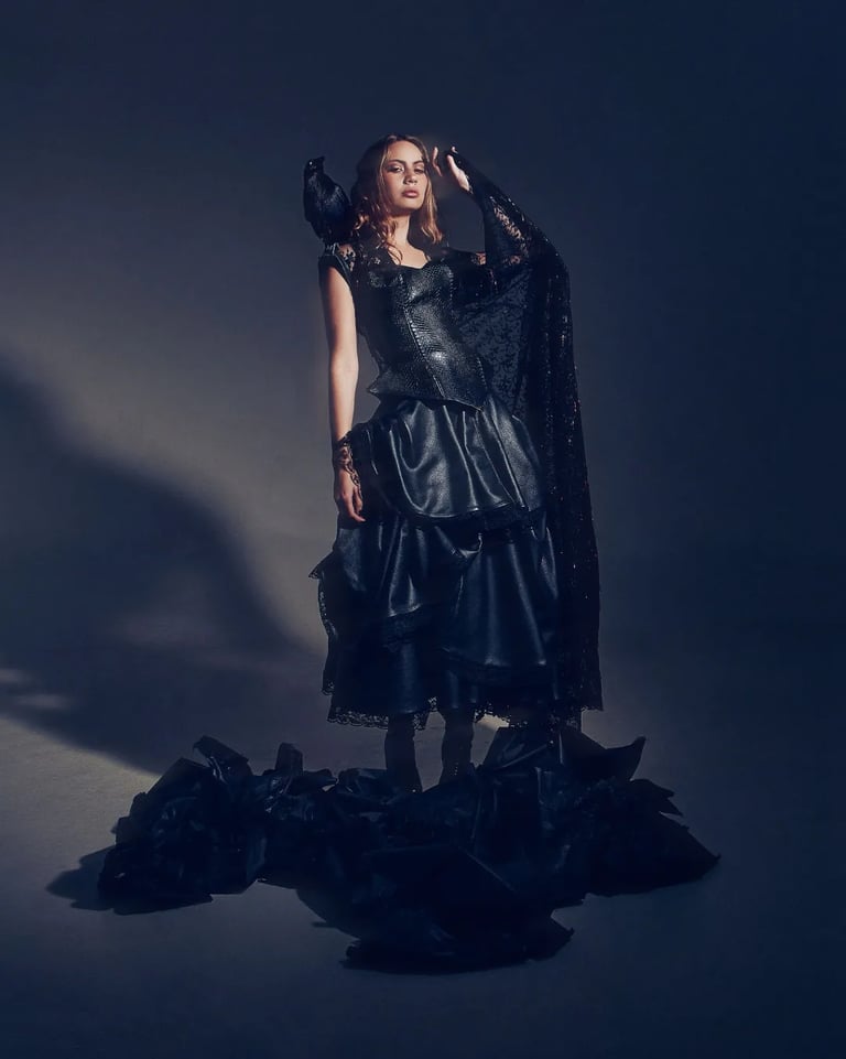 Marina: Corset y falda construidos en cuero, cosidos integralmente a mano con técnicas de marroquinería.
